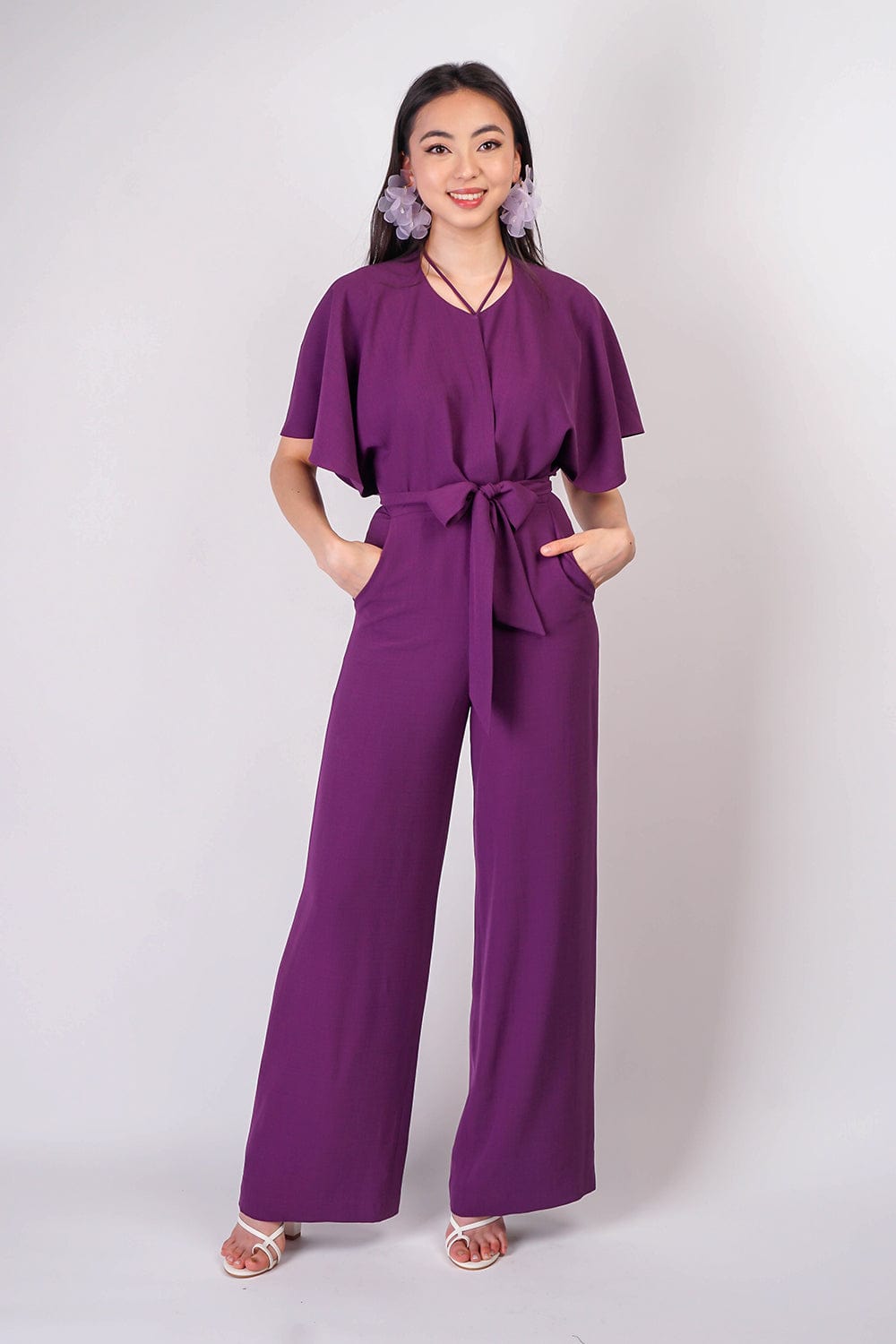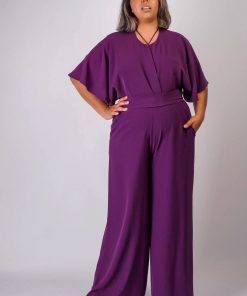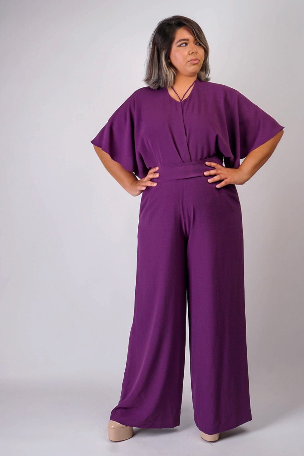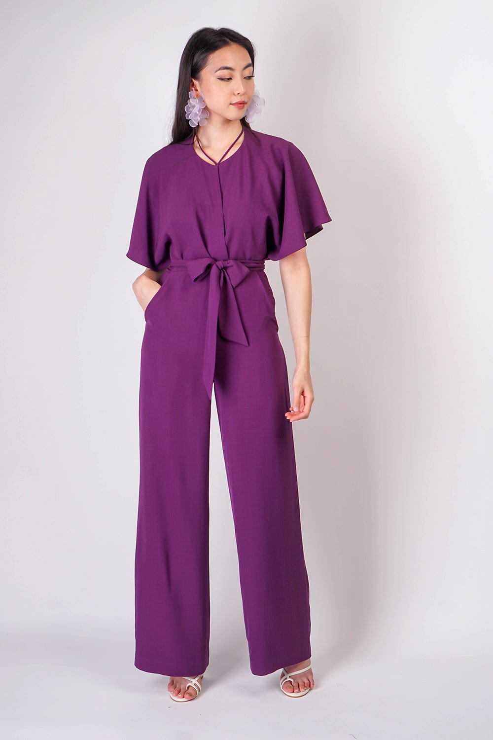 This Eggplant Pleated Wrap Necee Jumpsuit features a criss cross neckline with a hook and eye closure at the back, draped short sleeves, and a tie-belt at the waist. The high waist and straight leg pants are complimented by a center back zipper and side pockets. Designed by Chloe Dao.