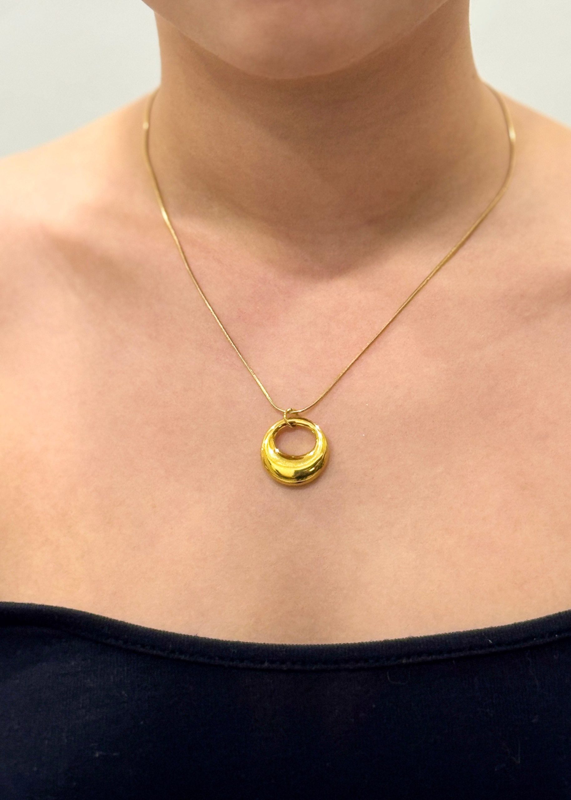 Elevate your everyday elegance with this timeless gold plated circle ring necklace. The minimalist design features a delicate circular pendant that catches light beautifully, making it the perfect layering piece or standalone statement.