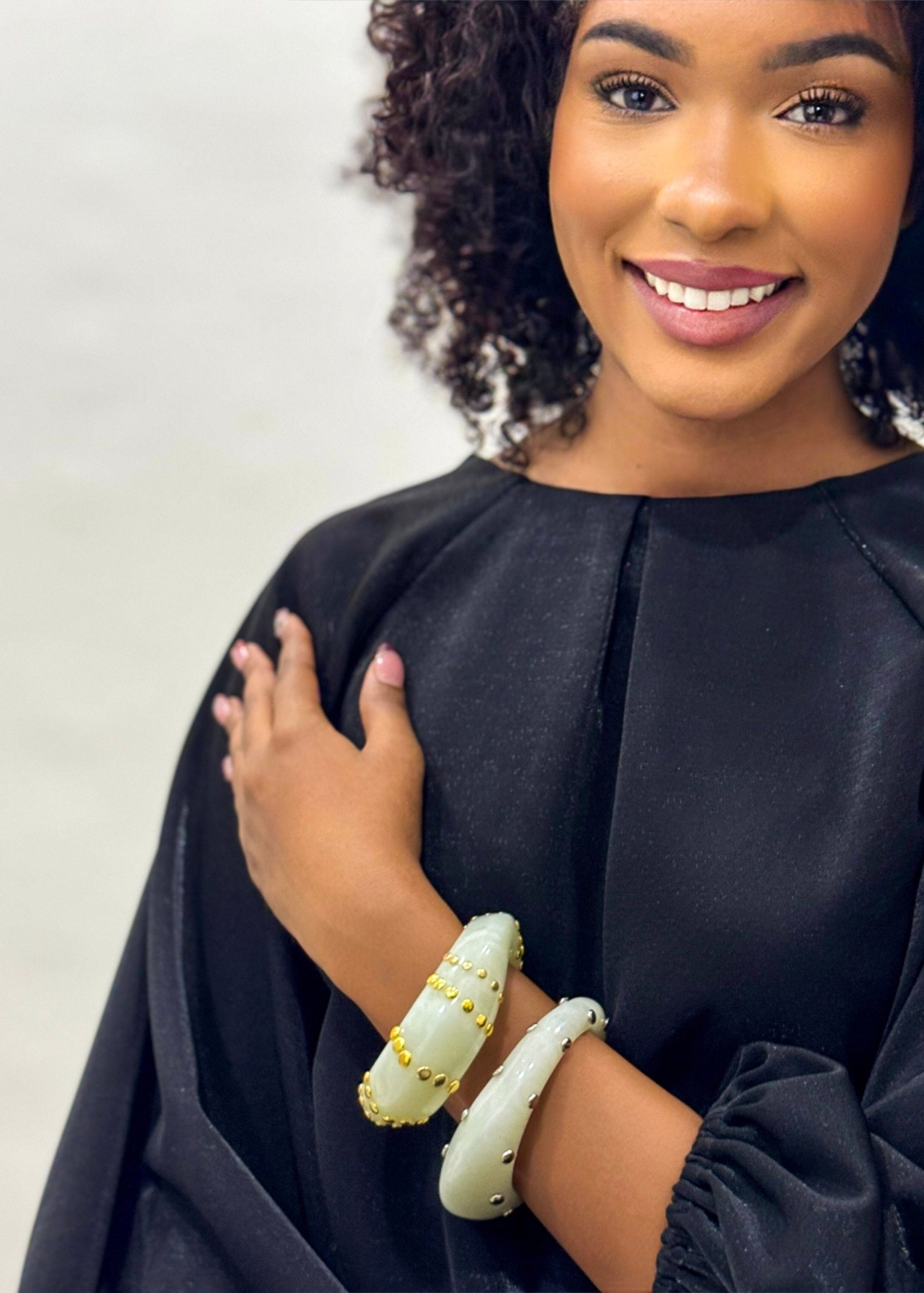 Crafted from lustrous resin with striking silver rivets, this ivory bracelet merges modern edge with timeless elegance. The inner silver detailing catches light beautifully, adding dimension and sophistication to any wrist. Perfect for layering or wearing solo, this statement piece elevates everyday style while maintaining the refined aesthetic of luxury accessories.
