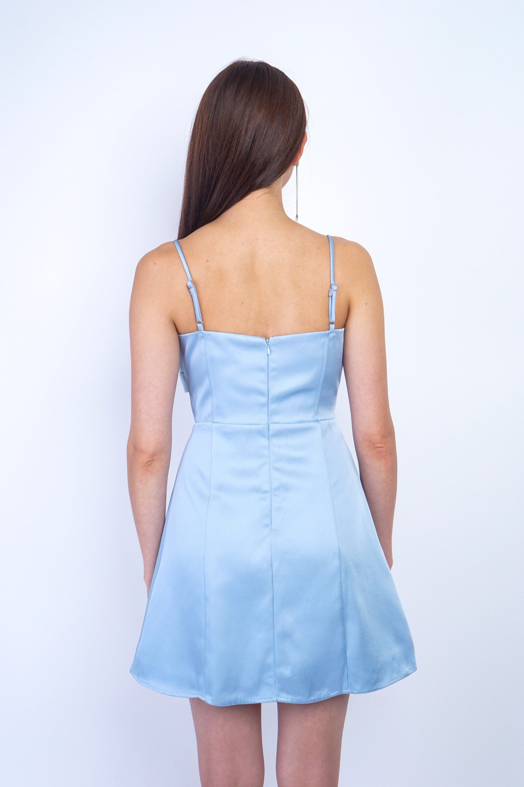 This baby blue sleeveless dress features elegant front pleats and a flattering short length, making it the perfect choice for a memorable homecoming.
