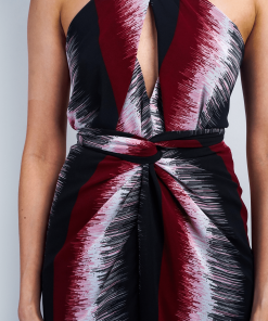 Expertly designed by Chloe Dao, this Red Black Print Indo Wrap Halter Top is a versatile and sustainable fashion piece. It offers multiple styling options and can be paired with the matching skirt/dress or other bottoms for a chic and eco-friendly look. Only 6 of these limited edition pieces were made, making it a unique addition to any wardrobe.