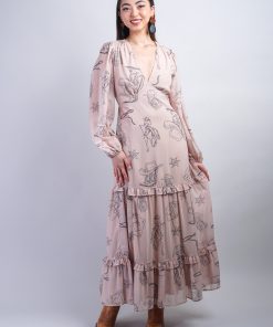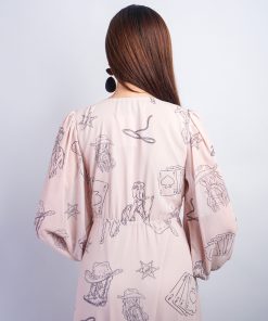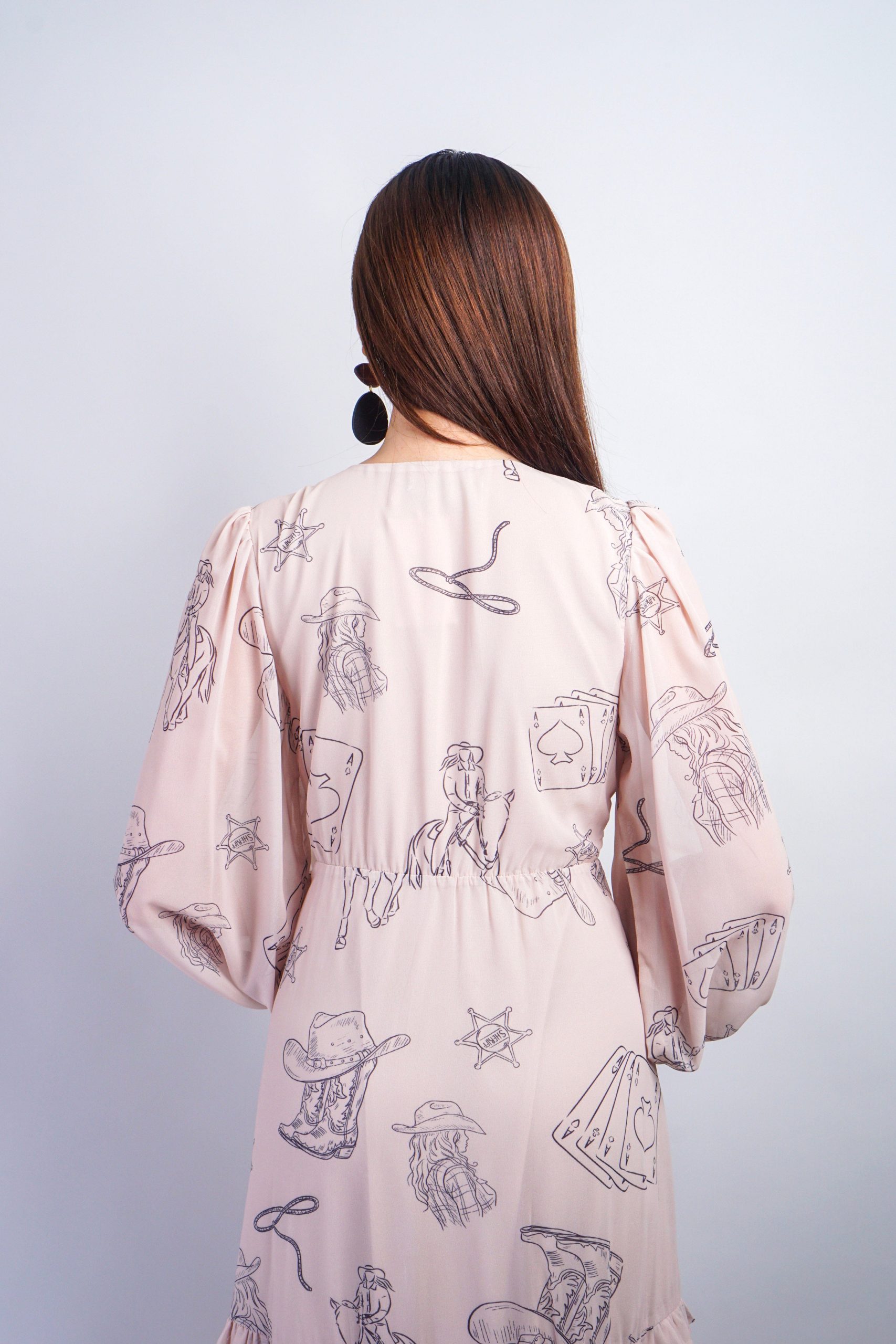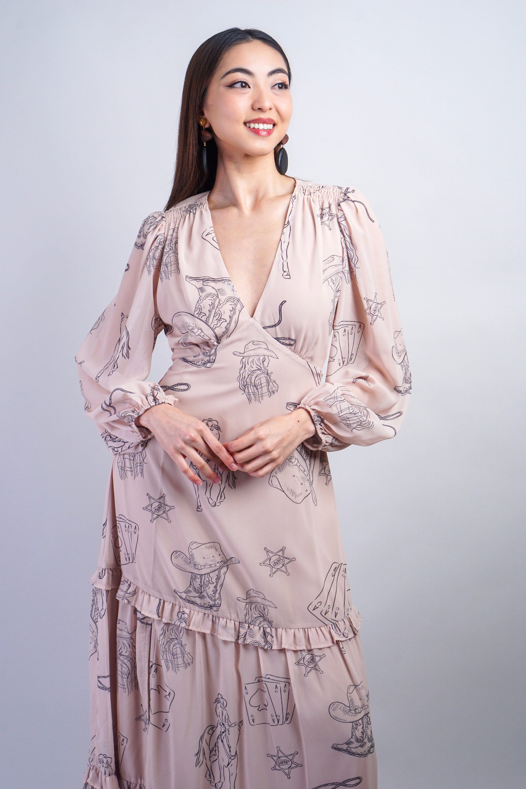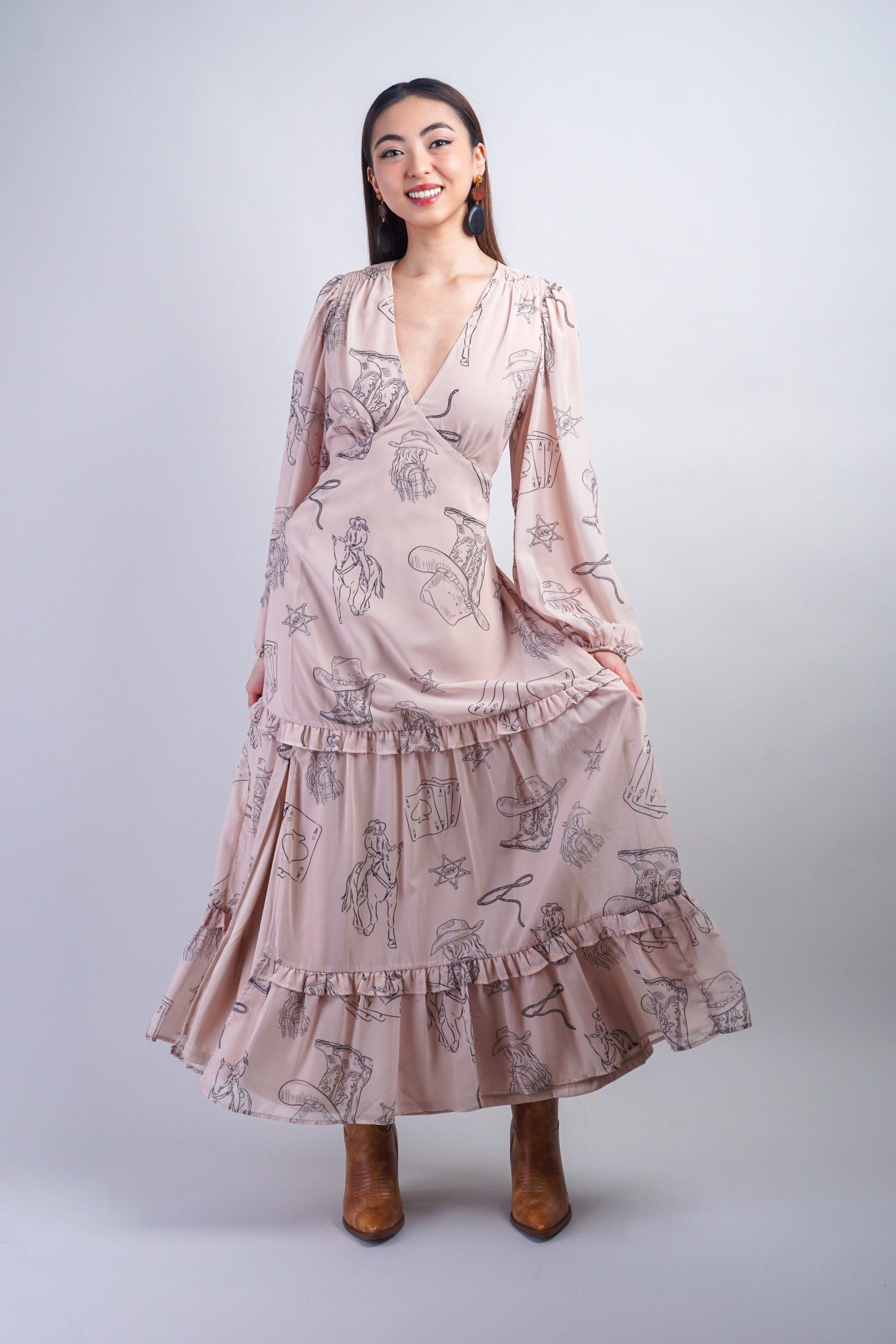 Embrace Western-inspired elegance with this striking midi dress, featuring a bold cowboy print in rich taupe tones. The deep V-neckline creates a flattering silhouette while long sleeves offer refined coverage. Perfect for those who appreciate statement pieces with understated sophistication, this dress transitions effortlessly from casual outings to curated evening looks.