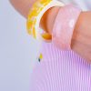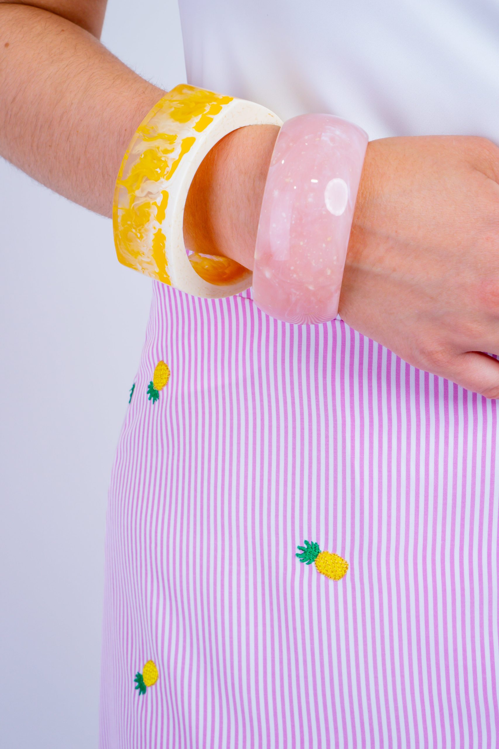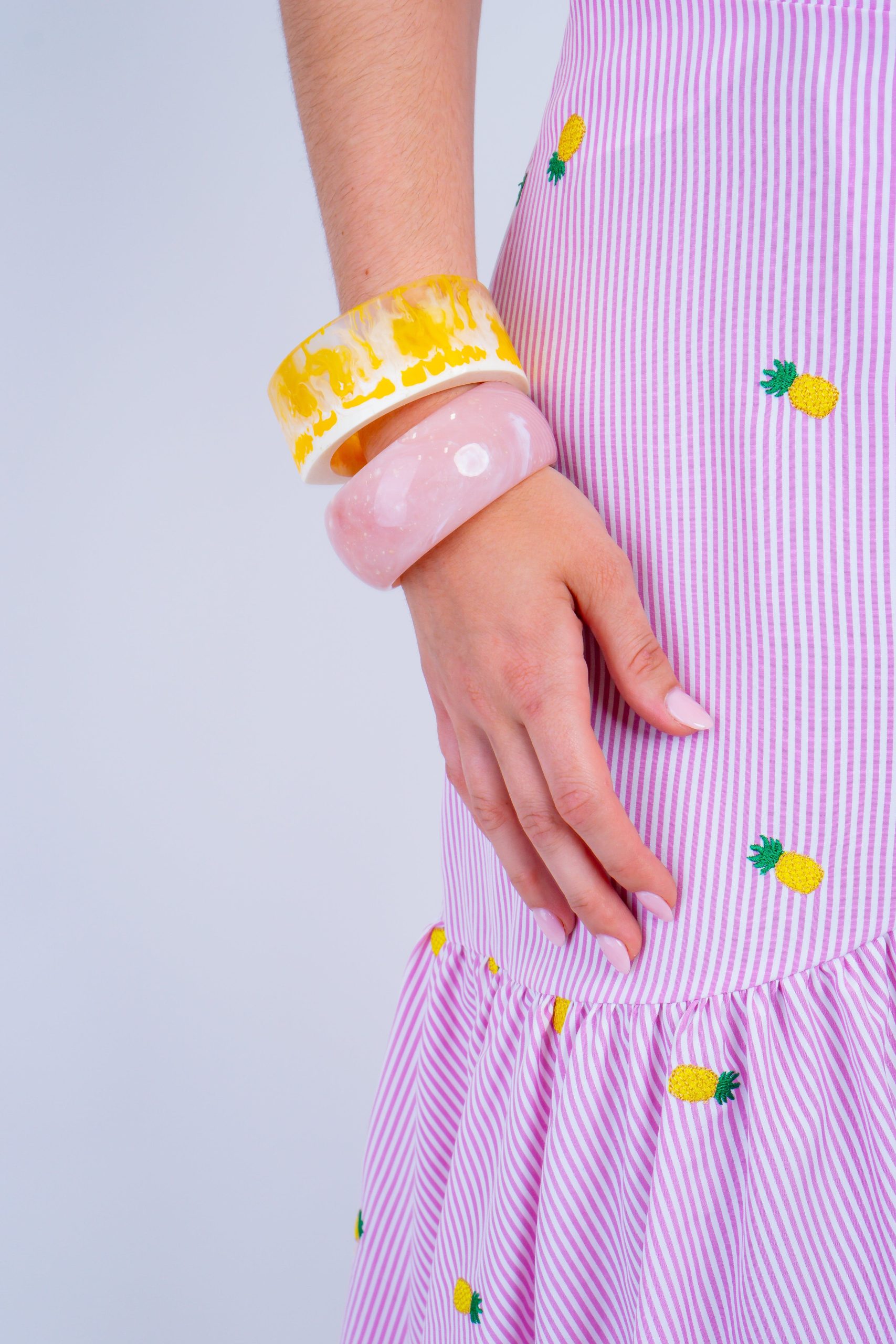 White and yellow Acrylic bracelet with a bold, marbled pattern. Its wide, curved shape makes a playful statement, perfect for adding a pop of color to any look.